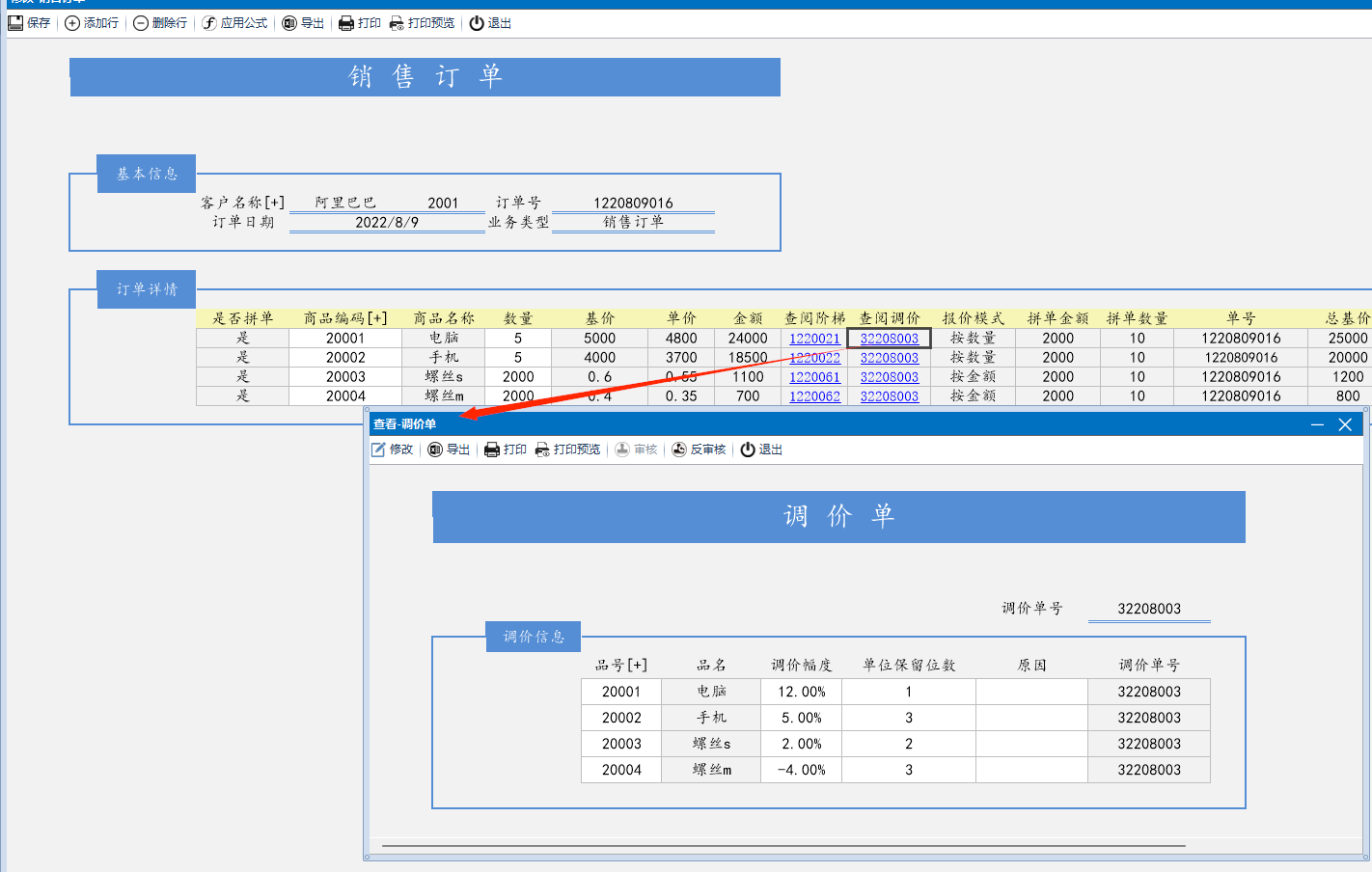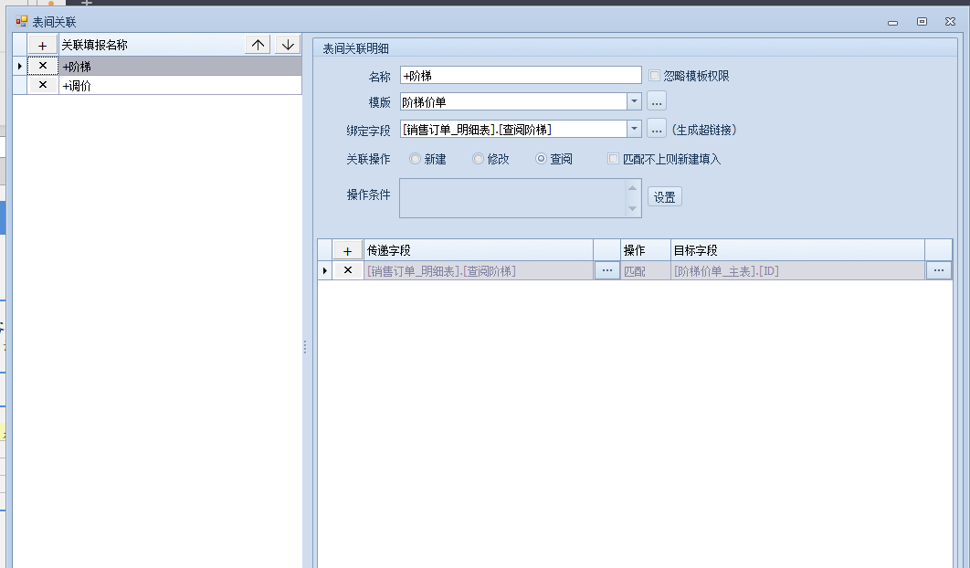 建立表间关联,当点击查阅阶梯和查阅调价时,弹出相应的阶梯价或者调价单