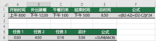 如果仅对小时和分钟进行加法运算并希望以这种方式显示,可求和,无需乘以 24,因此,在第二个示例中,我们使用 =SUM(A6:C6),因为对于所分配的任务,我们只需要小时和分钟的总数(5:36,即 5 小时 36 分)。