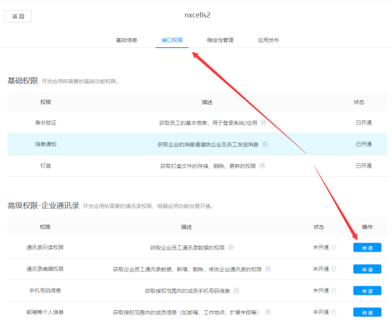 开通通讯录只读权限,方便NxCells系统用户与钉钉用户的同步。