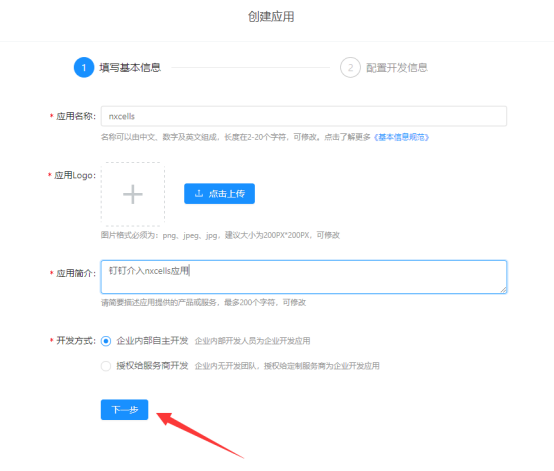注意:开发应用类型应选择【微应用】