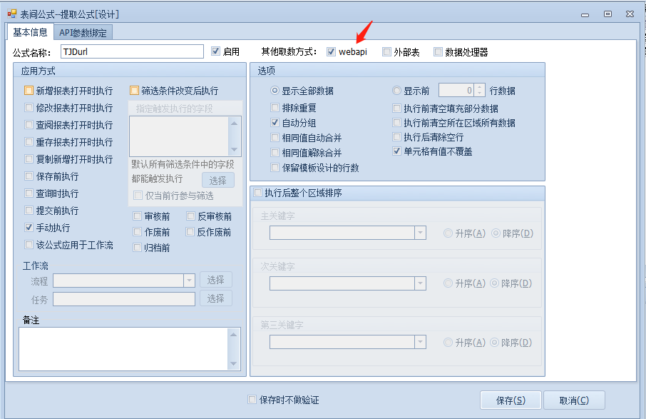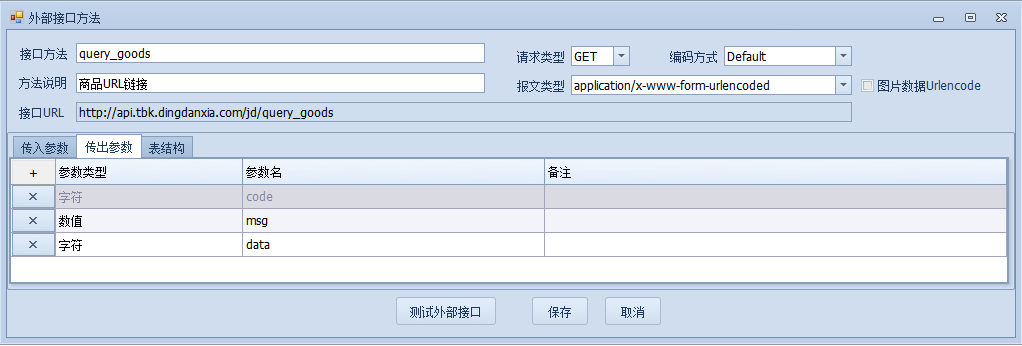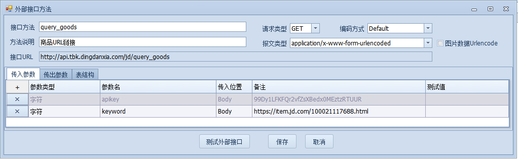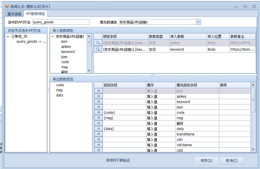 由上方的web api建立可看出,该京东提供的api有两个传入参数,三个传出参数。表间公式定义如下: