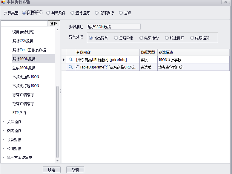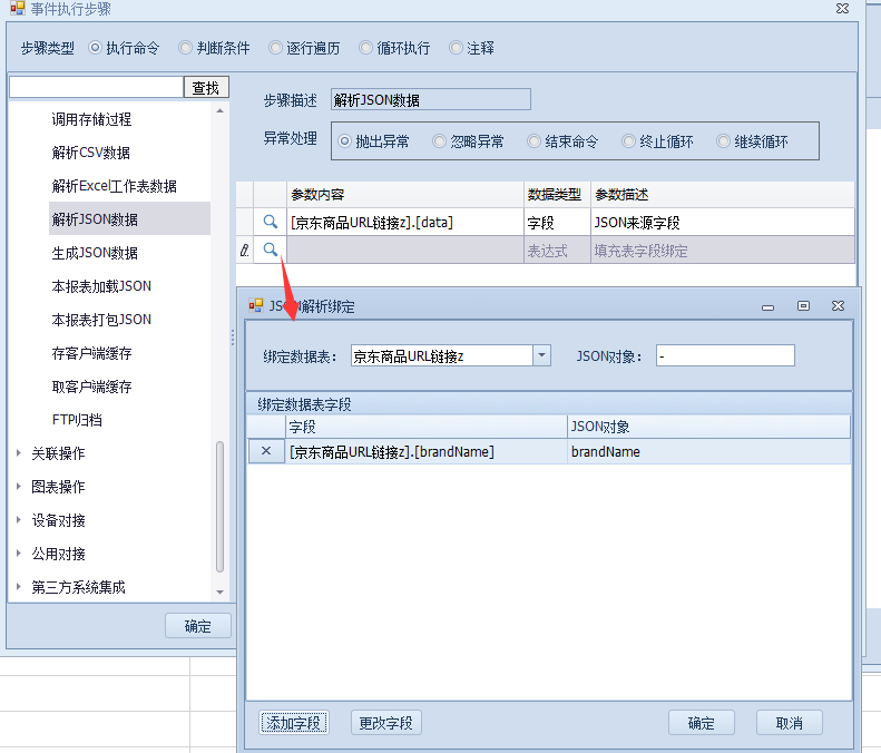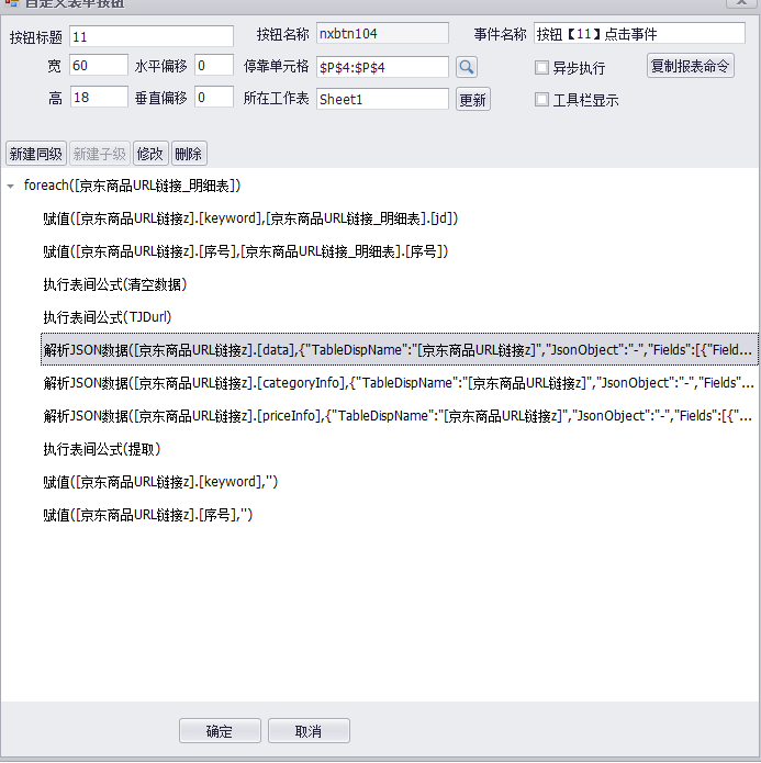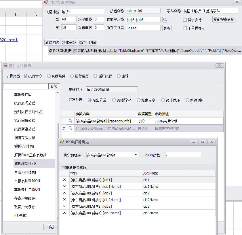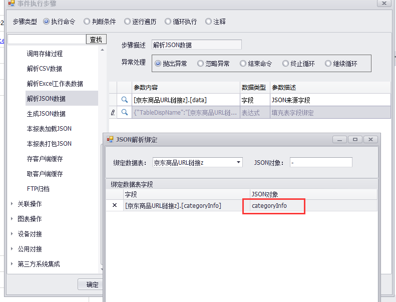 在原有的报表命令中建立同级,对categoryInfo的内容进行解析,进行填报,点击读取JD,然后点击按钮解析1如下图效果: