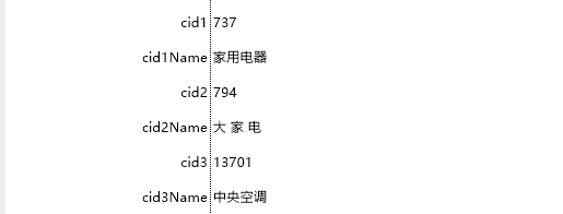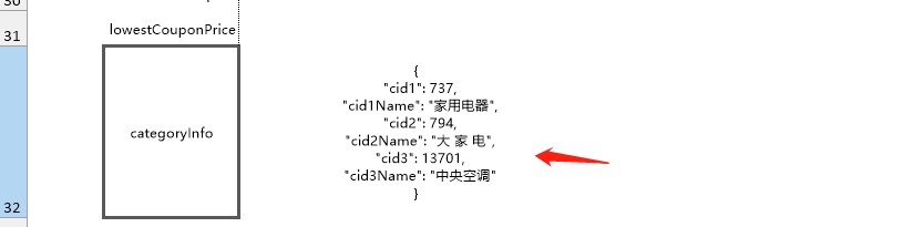 继续向下解析:可以看到categoryInfo:下面有几个字段分别为cid1和cid1Name到cid3和cid3Name,这几个字段是一个json整体,不能单独的像brandName这样直接一下就可以解析到字段中去,我们从data内容可以发现cid1和cid1Name到cid3和cid3Name是属于categoryInfo这个里面的,所以我们要建立一个categoryInfo的主表字段,把它的内容从data中解析出来,建立报命令如下: