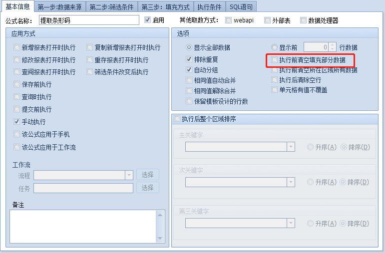 上一页 问题描述:有两个产品没有录入产品表,需要手动填入条形码,填入后保存发现刚录入的数据又消失了 解决方案:首先想到的就是提取公式把数据清掉了,查看公式发现提取条形码的公式勾选了执行前清空填充部分数据,因为这两条没录入系统,所以将手填的条形码清空之后也没有数据填充进来,去掉这个勾选就可以 下一页作者:admin 创建时间:2021-12-07 15:22最后编辑:test 更新时间:2025-10-14 15:38