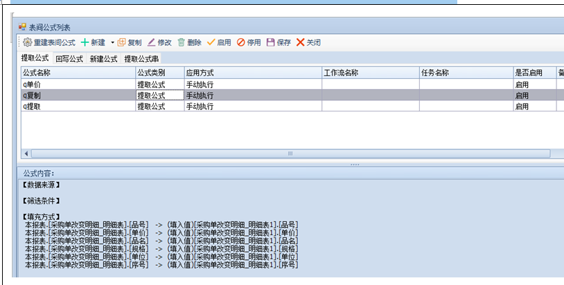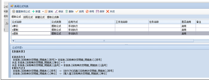 q复制公式用于将明细表中的数据复制到临时表,主要是用于记录没有历史数据、手工填写单价信息的产品信息(原因是因为当执行q单价时,会将填充区域清空,手工填写的单价信息也会被清空,所以需要临时表来保存清空前的单价数据)