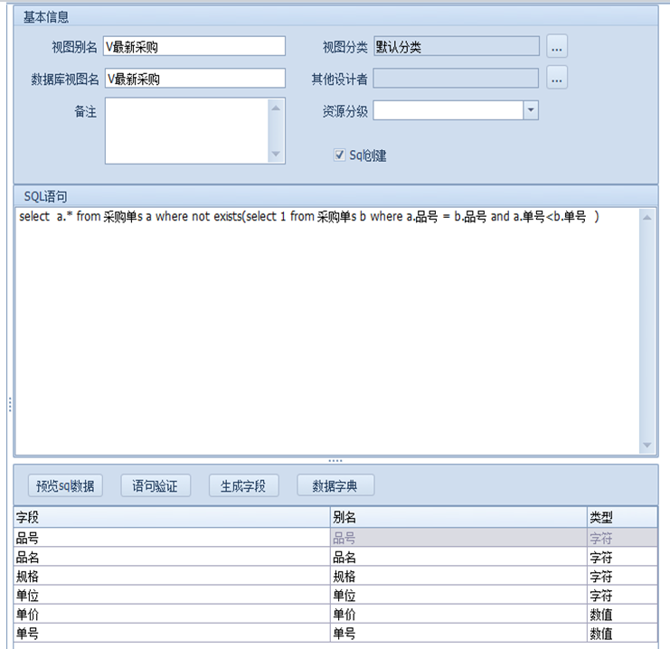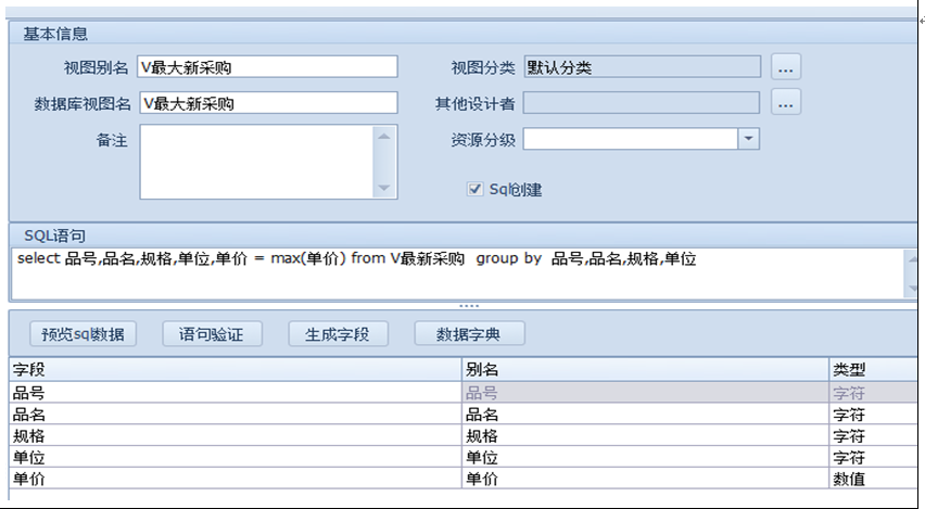 最新的单价信息:手工编写sql语句,因为单号是递增的,所以寻找最大的单号,即最新的价格信息
