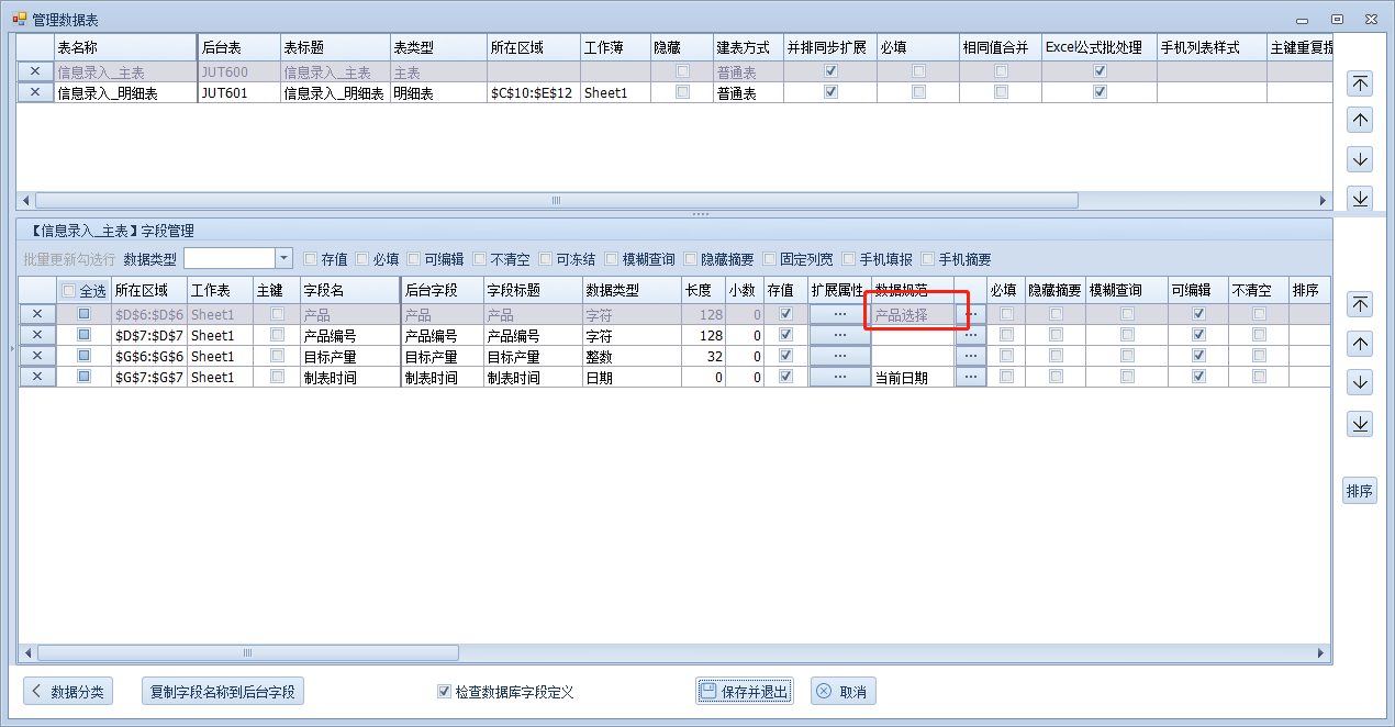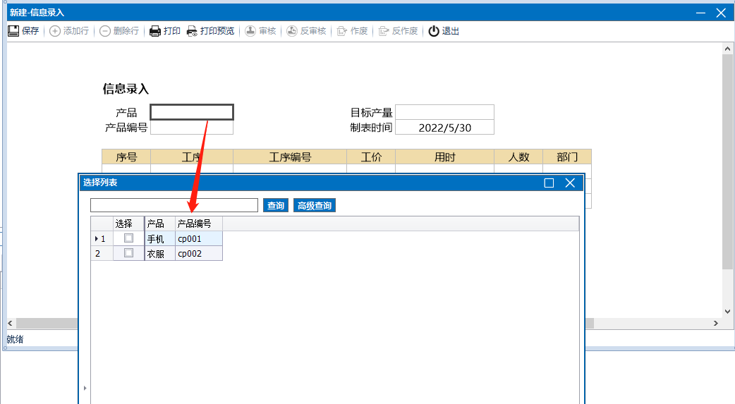 3、 信息录入模板是绑定该列表的模板,我们做一个产品选择的列表绑定在主表的产品字段上