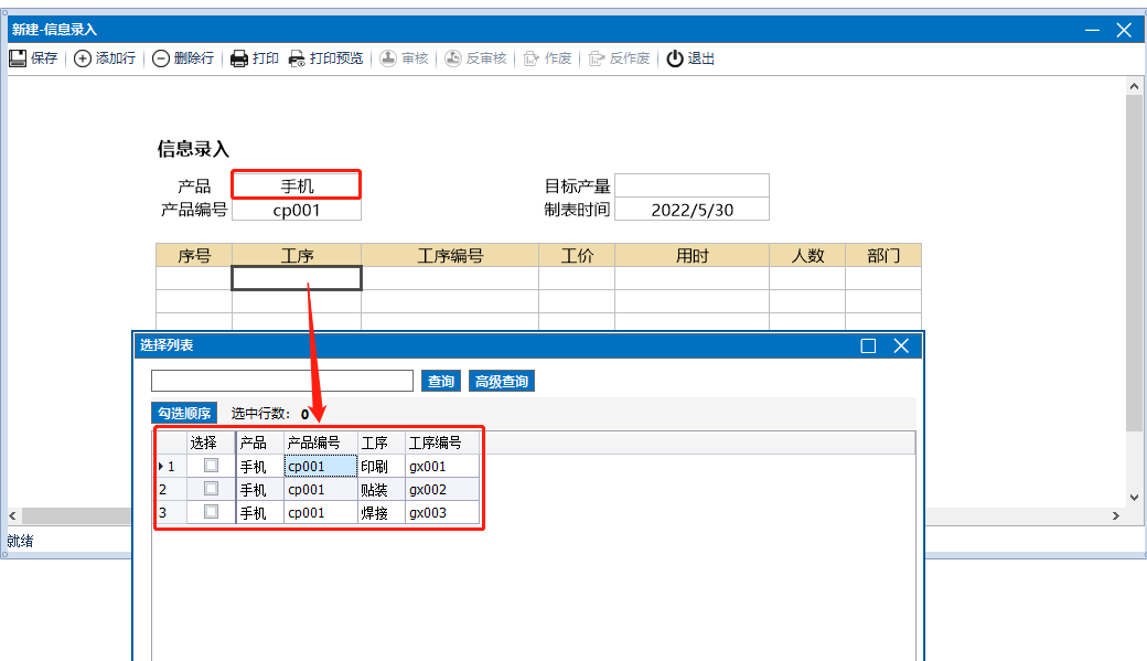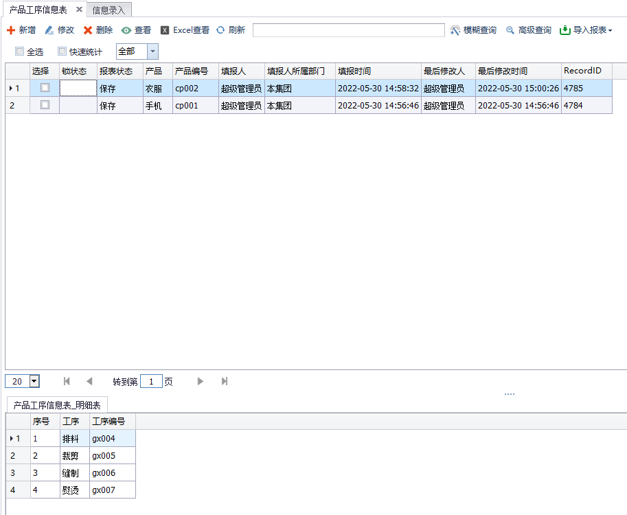 1、 产品工序信息表作为数据来源,方便后续模板的引用,该案例做了两条测试数据