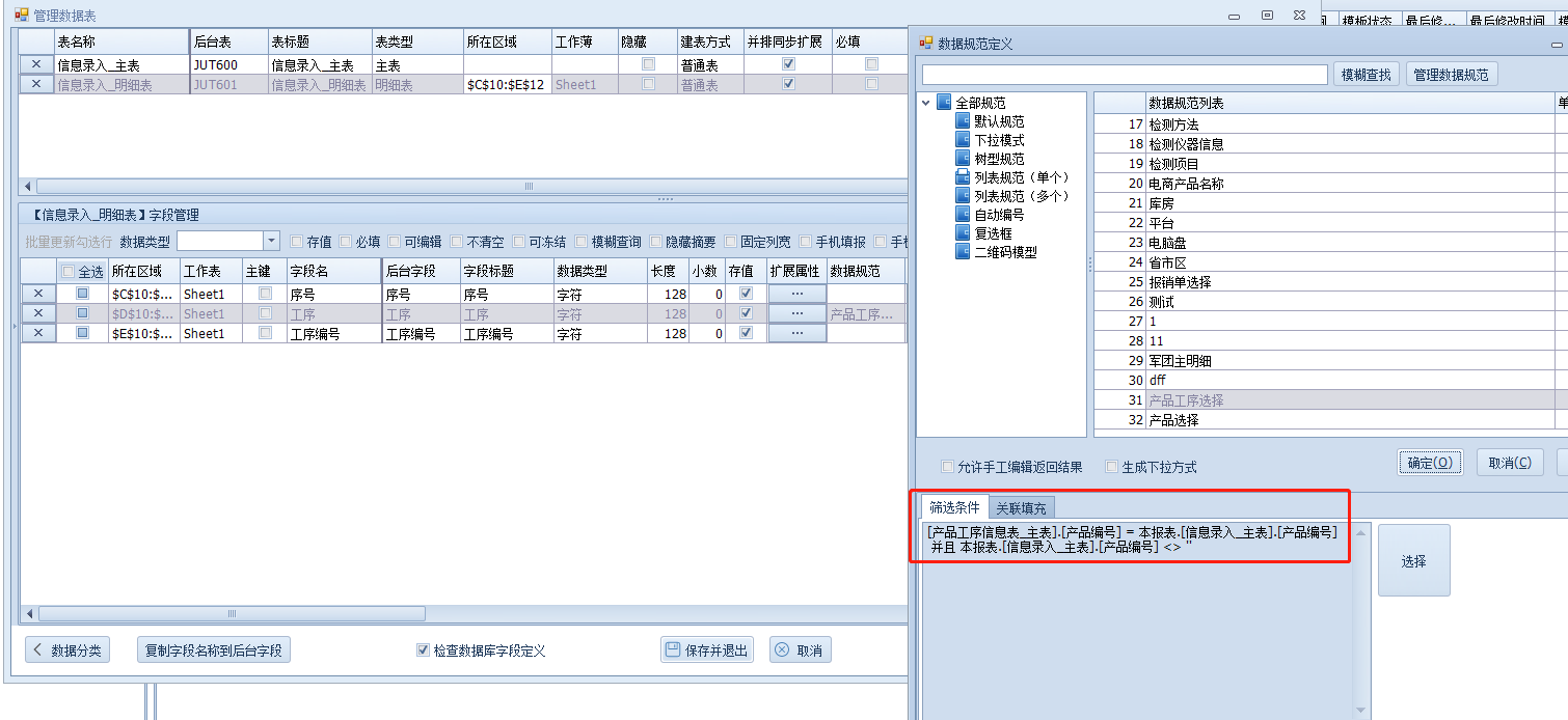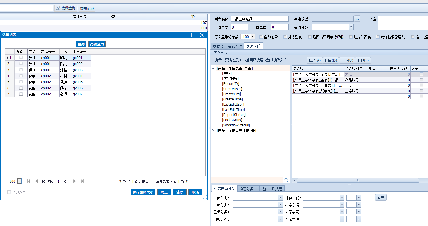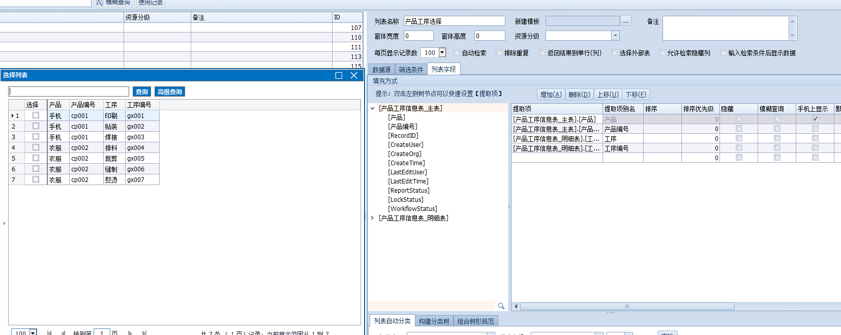 4、 下面明细表的工序,绑定上面做的产品工序选择的列表方式,并写上筛选条件,主表的产品与产品工序信息表的产品做匹配,这样就会只显示该产品的工序