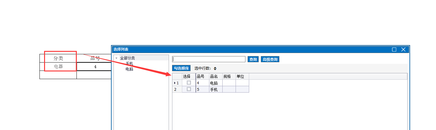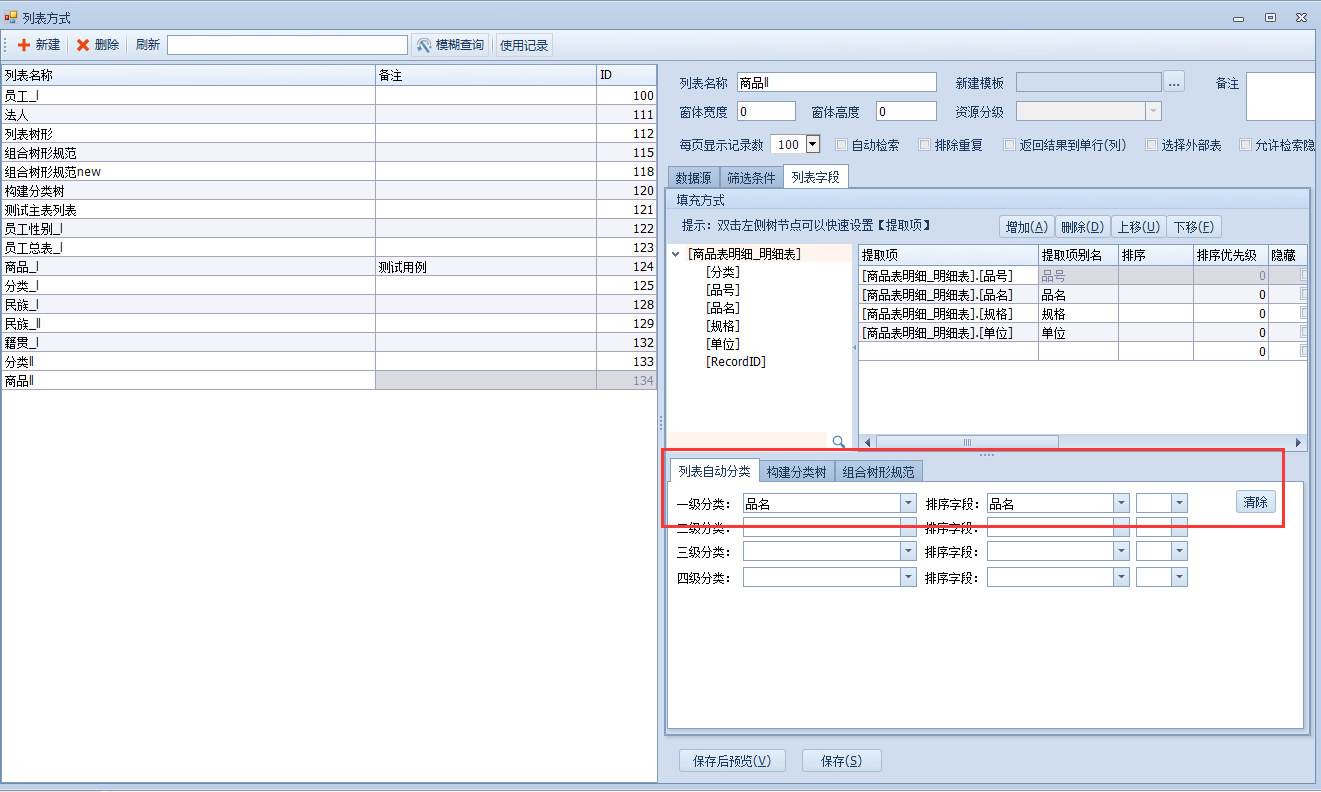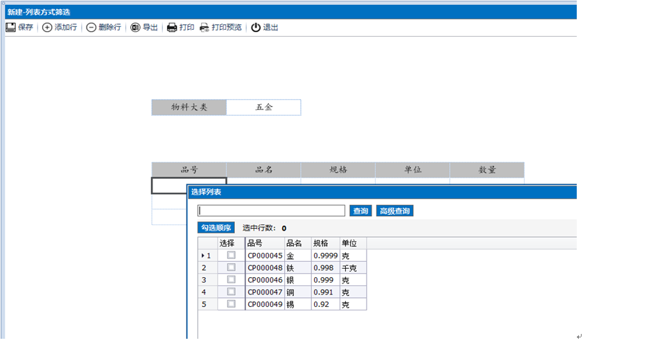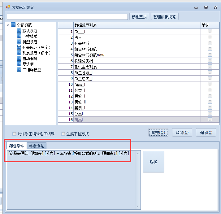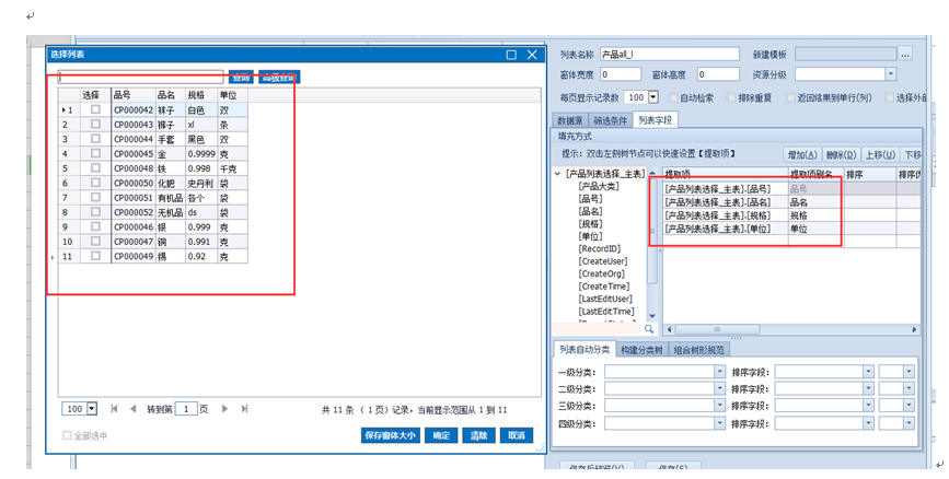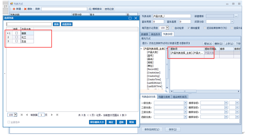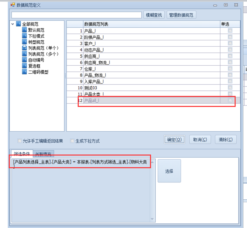 【物料大类】绑定产品大类l的列表方式,【品号】绑定产品alll列表如下,要在筛选条件中填写([产品列表选择主表].[产品大类] = 本报表.[列表方式筛选主表].[物料大类]),经过筛选之后,选择不同物料大类,选择产品的时候列表只展示出属于该类下的产品信息
