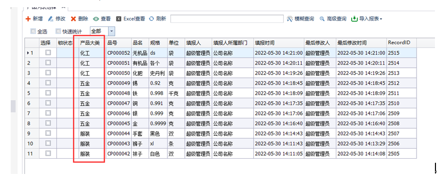 有以下的产品列表,每件商品都属于一个产品大类(化工、五金、服装)