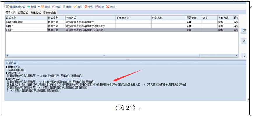 审核方可生效和寻找最新的调价单实现方式和阶梯价相同,此处不在赘述,新建提取公式修改调价后的单价(图21)