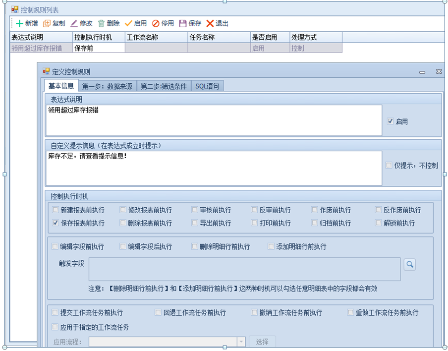 提示后如果需要控制超出库存无法保存和提交操作需要做控制规则: