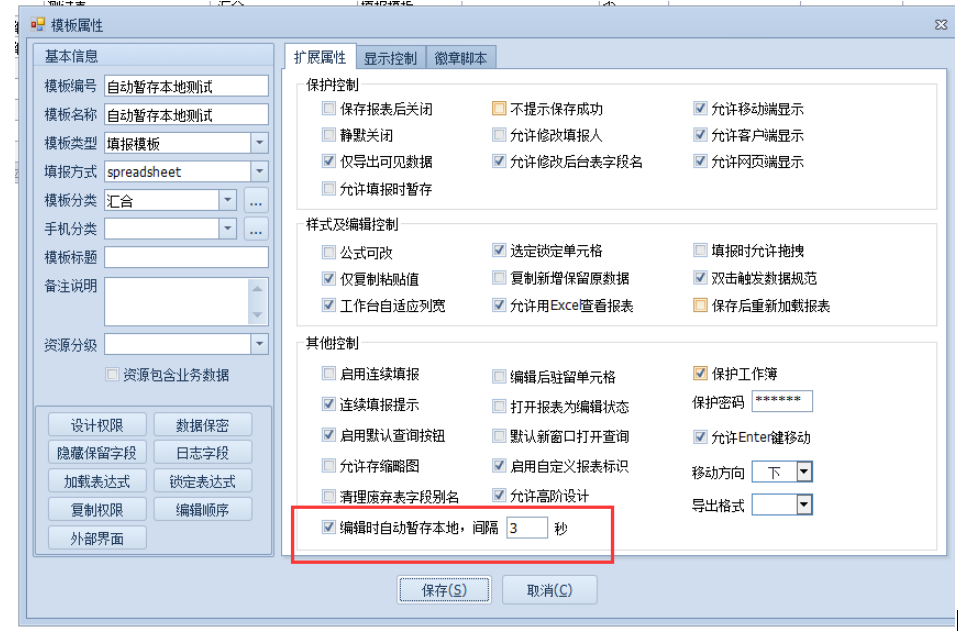 在【模板属性】-【其他控制】中勾选【编辑时自动暂存本地】,间隔多少秒暂存一次数据