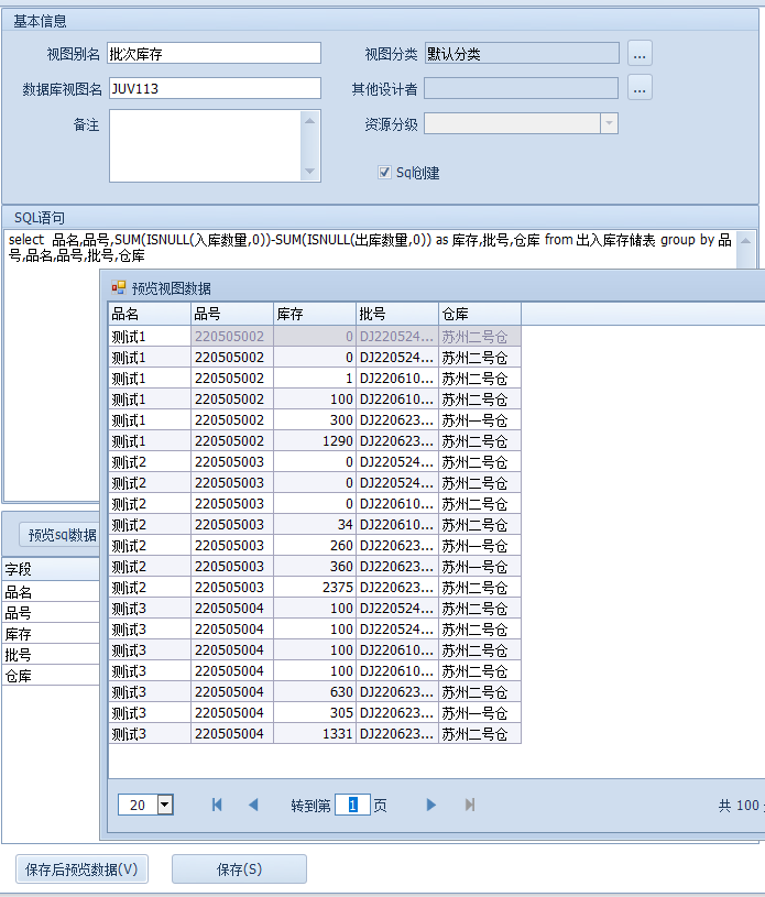 这里的数据来源【批次库存】是用的视图,生成同一品名不同批号的库存数量
