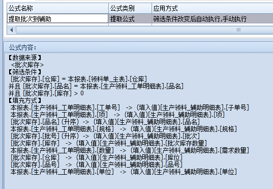 选择完仓库、品名后,通过提取公式,将数据提取到辅助表,这里品名和批号做了升序处理,从小到大排序,达到早入库的批号排在前便优先出库的目的