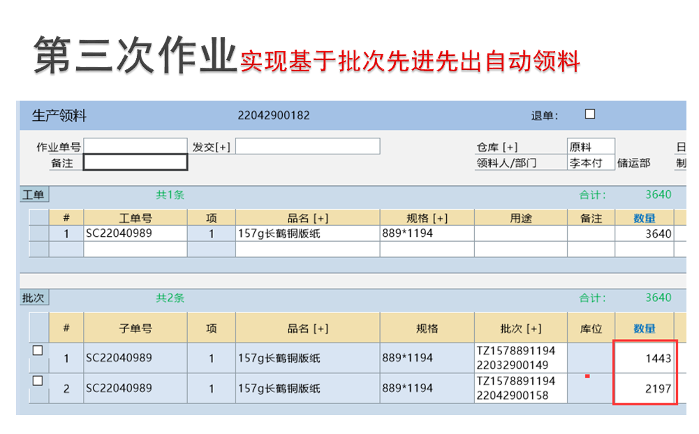 场景:同一物料有多批入库,现要根据批号对物料的出库实现先进先出
