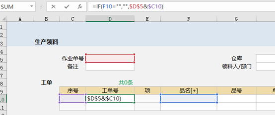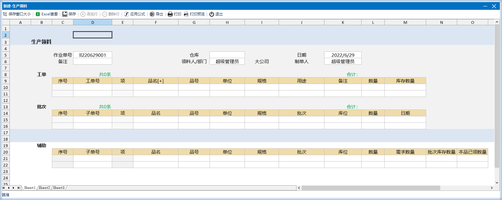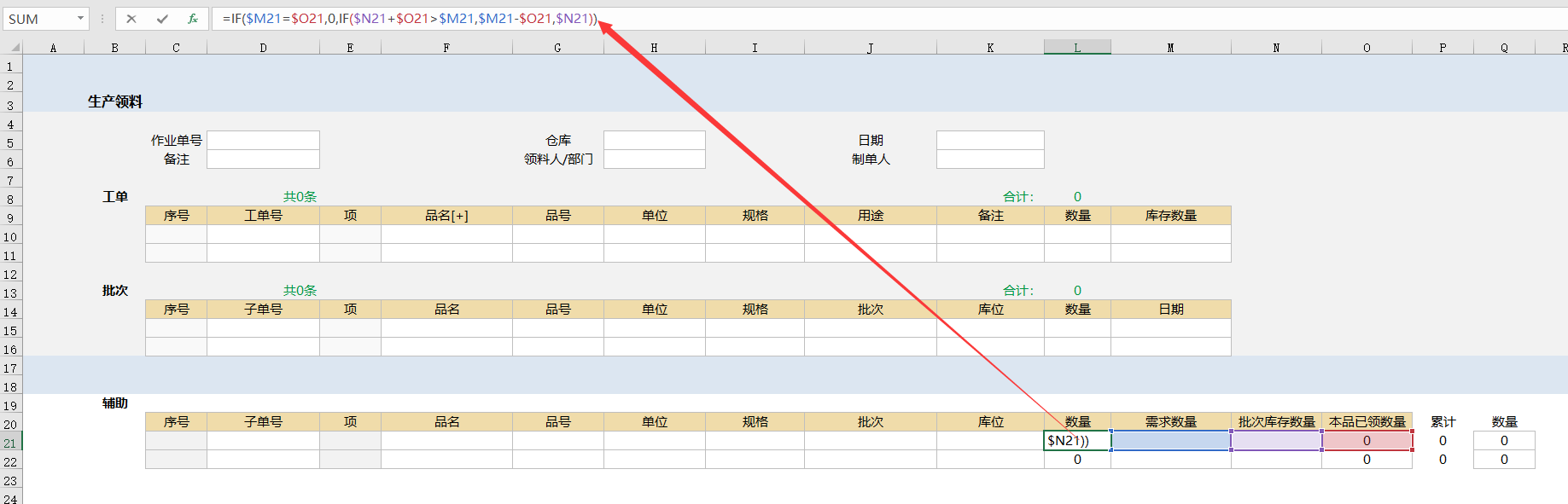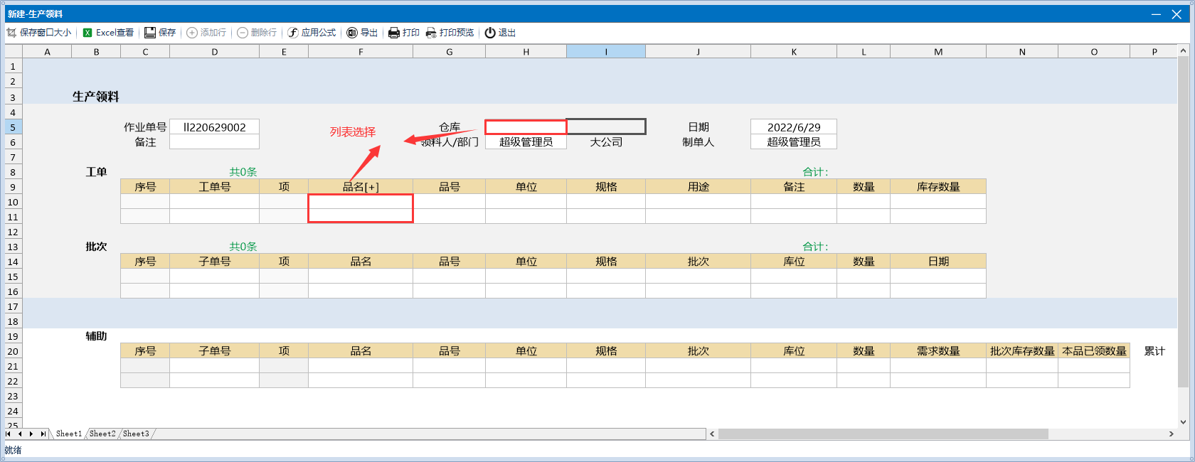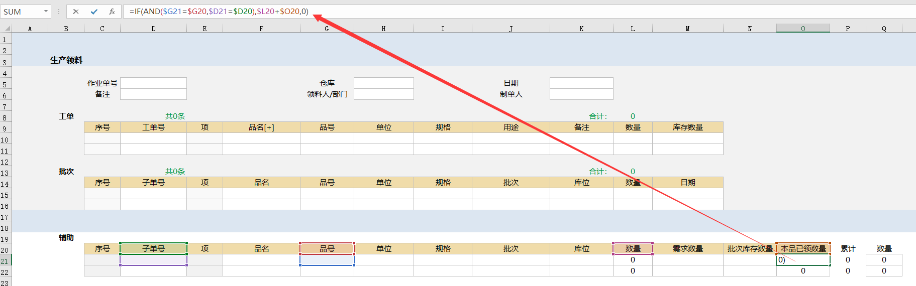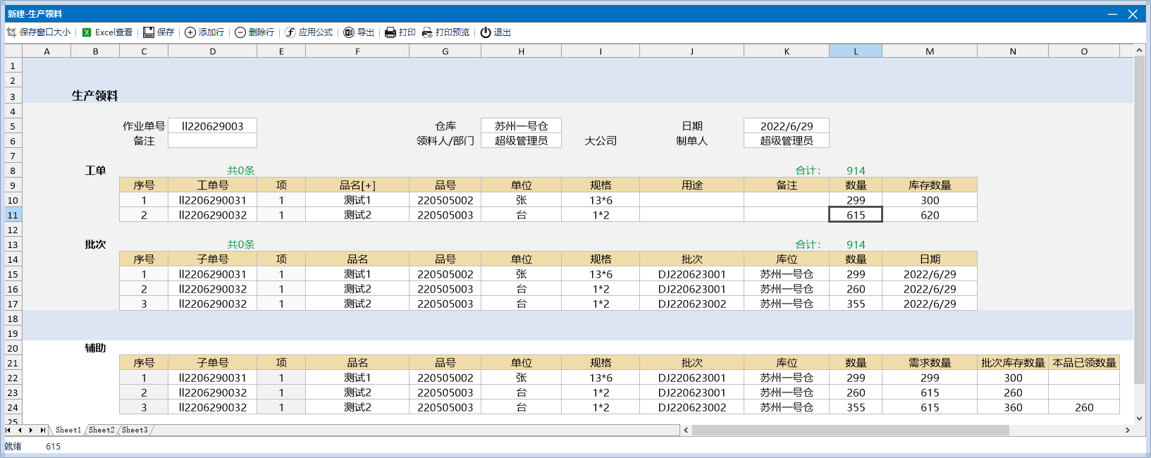 1、建立生产领料模板(工单明细表选择需要领料的产品,形成工单,在批次明细表根据上方工单填的数量,自动生成每个批次以及对应需要的数量)