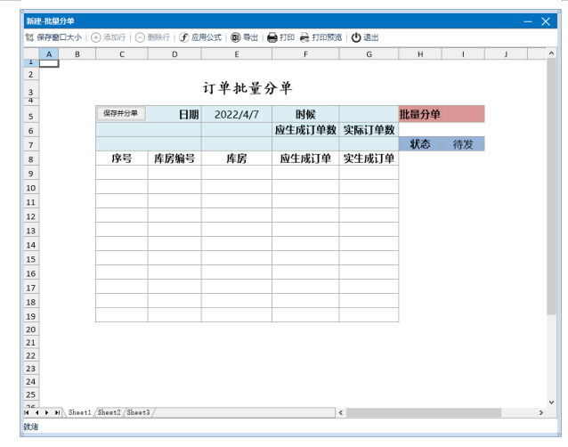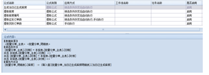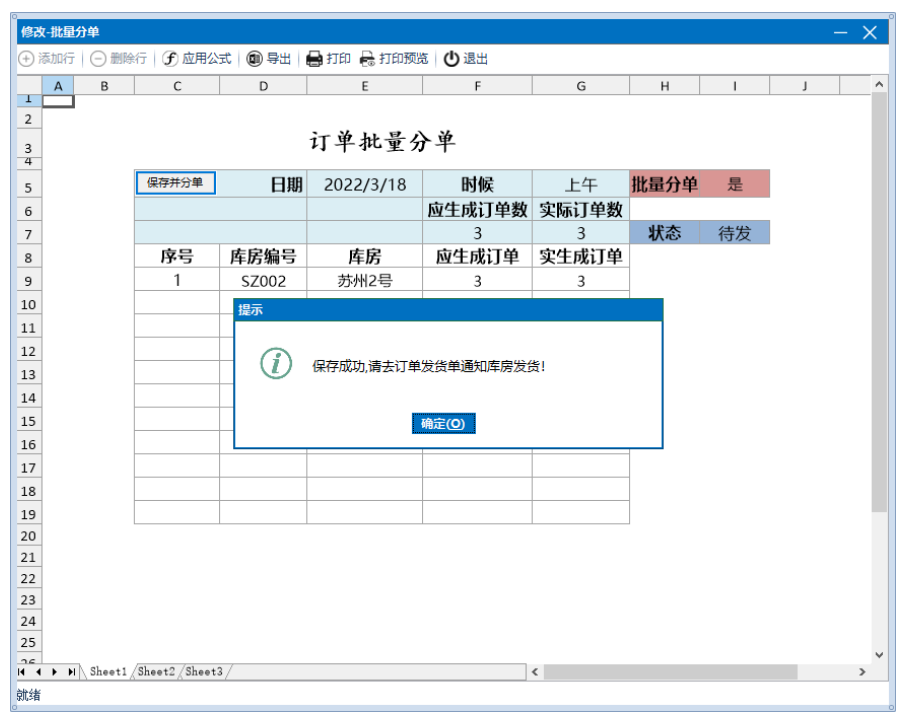 选择日期、时候,再批量分单选择“是”,就会显示对应库房有多少单,点击保存并分单按钮就会触发新建公式,生成对应库房的订单明细