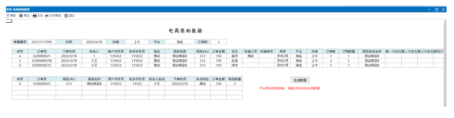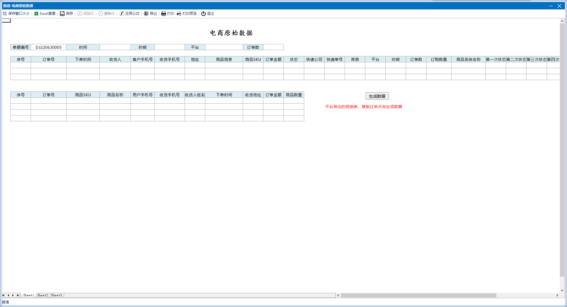 2、建一个原始数据表 用于将出售订单填写上传到系统 并且可以进行多单分单处理