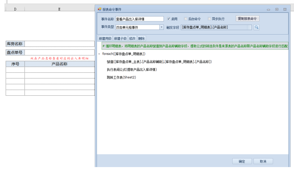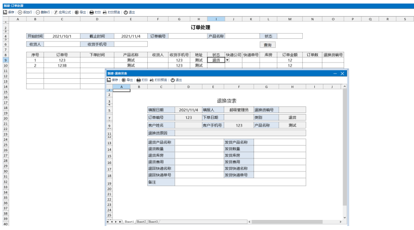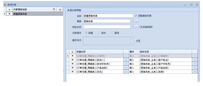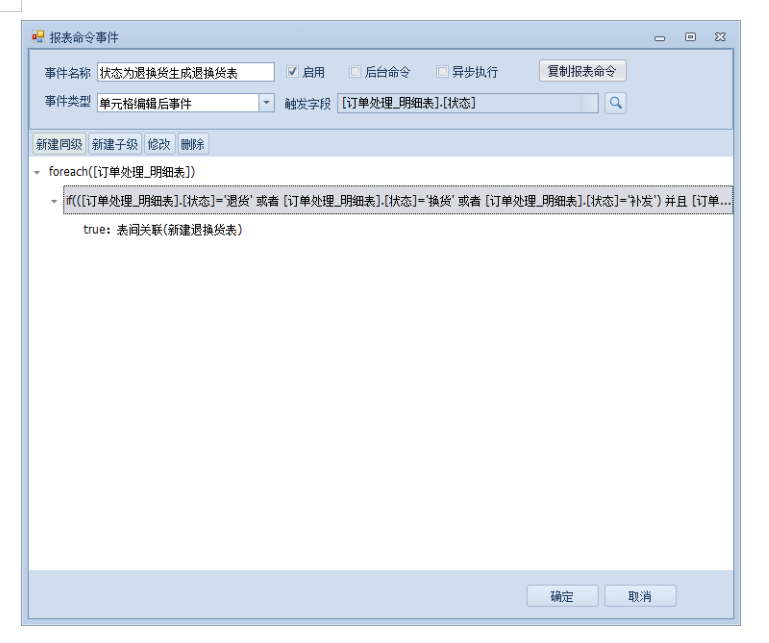 在订单处理中做新建退换货表的表间关联,再做个报表命令,单元格编辑后事件,绑定明细表的状态字段,将订单状态改为退换货/补发的时候,执行表间关联生成退换货表,