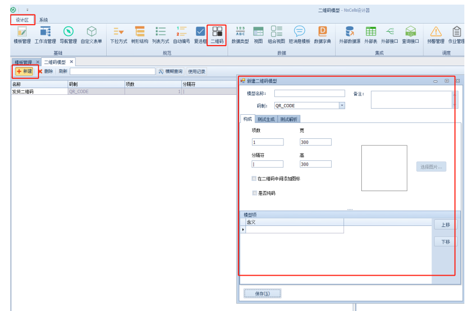 先在二维码模型中新建,默认码制OR_CODE就是二维码,也可选择其它码制,可自行看效果选择