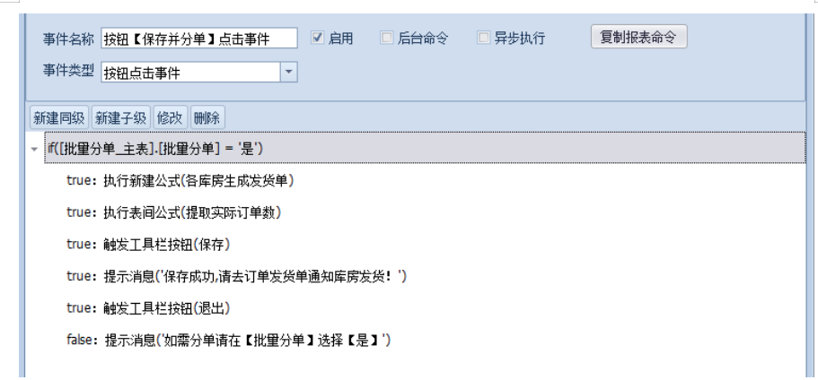 上边保存成功的提示是自定义的提示,点击保存并分单后触发公式