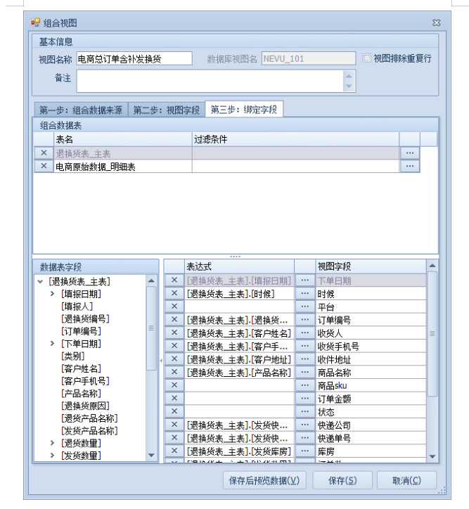 将这里的原始数据和后续的退换货表绑定到视图中使用