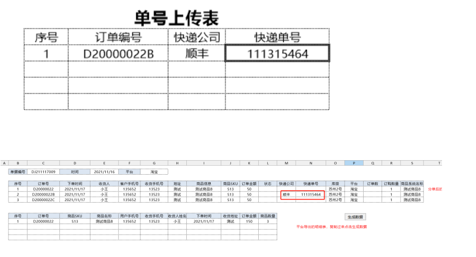 7、做一个单号上传的模板,用于根据库房发货的快递信息,按照订单号将快递单号回写到对应的原始数据中