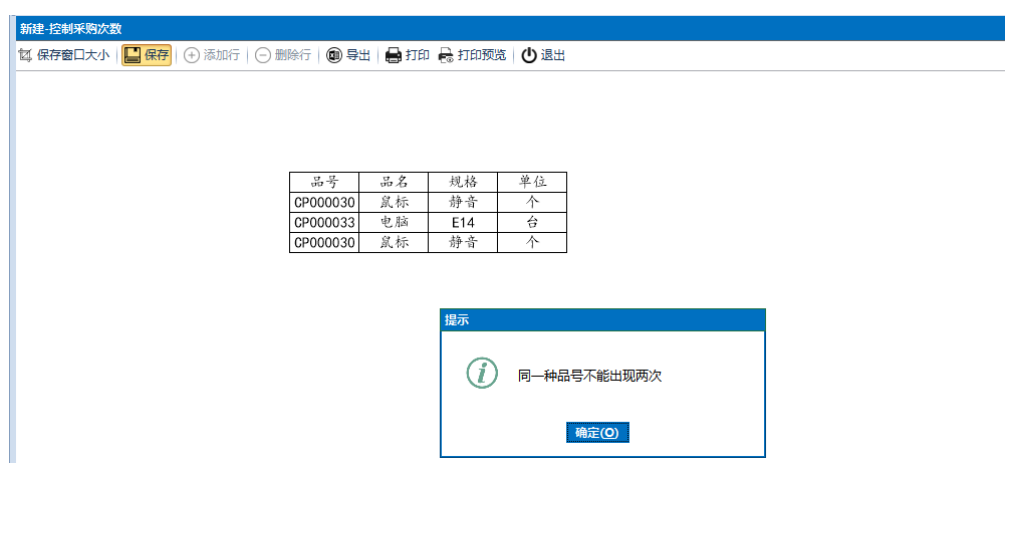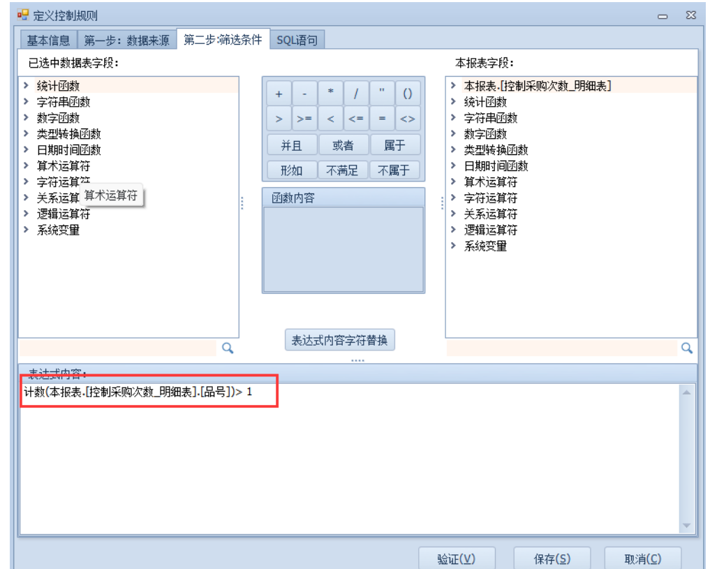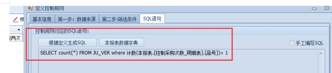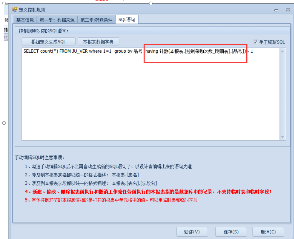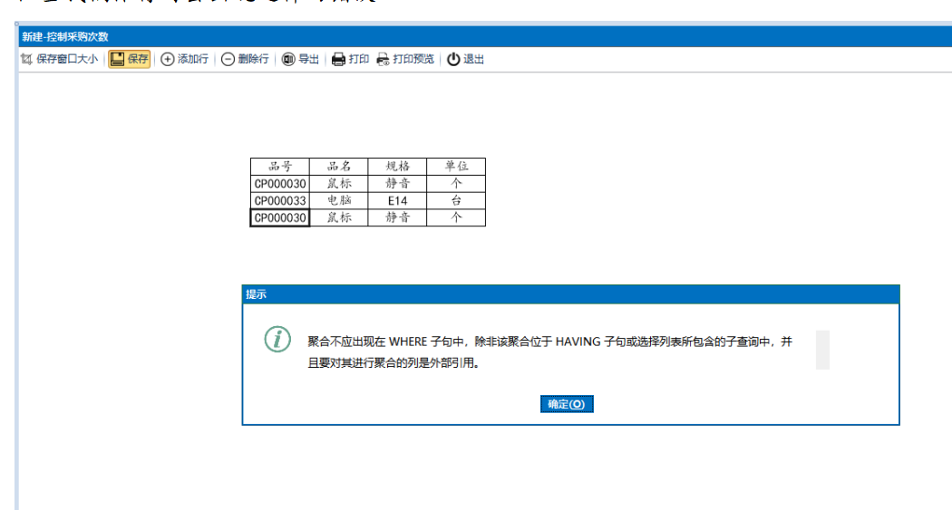上一页 控制一种产品不同在一张单子中不能出现两次一般我们可能会想到在筛选条件中使用统计函数(计数)但当我们保存时会出现这样的错误原因是因为聚合函数不能写在where语句中(sql的规则)这时我们可以手工编写一下sql语句,将聚合函数写在having子句中效果 下一页作者:严双圆 创建时间:2022-06-30 09:11最后编辑:test 更新时间:2025-10-14 15:38