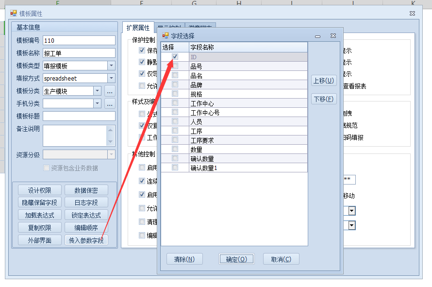当我们要传入参数时,需要在模板属性中选择【传入参数字段】勾选