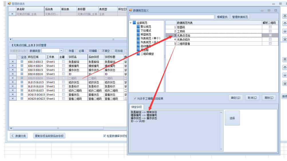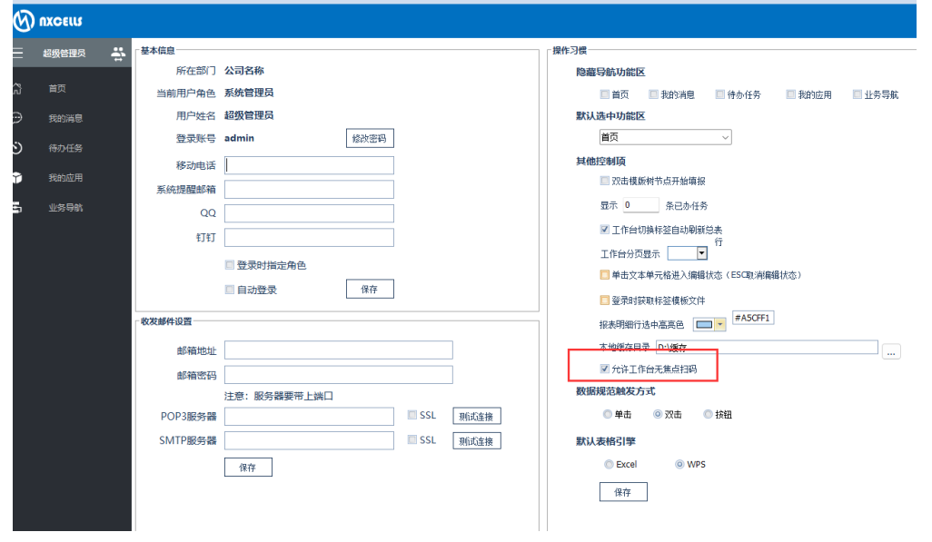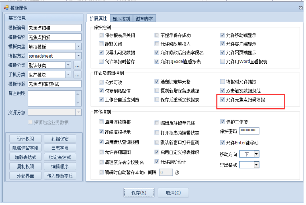 首先在模板属性中勾选【允许无焦点扫码填报】(现在的版本是默认支持,即模板属性中已取消该勾选,但仍然可以无焦点扫码填报)