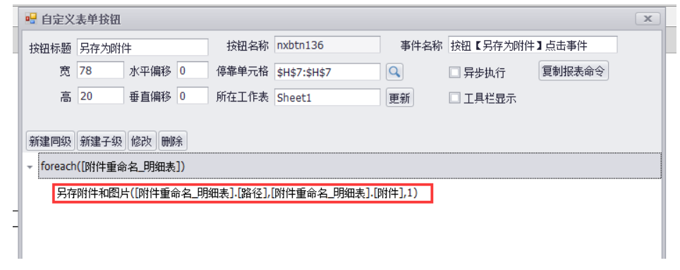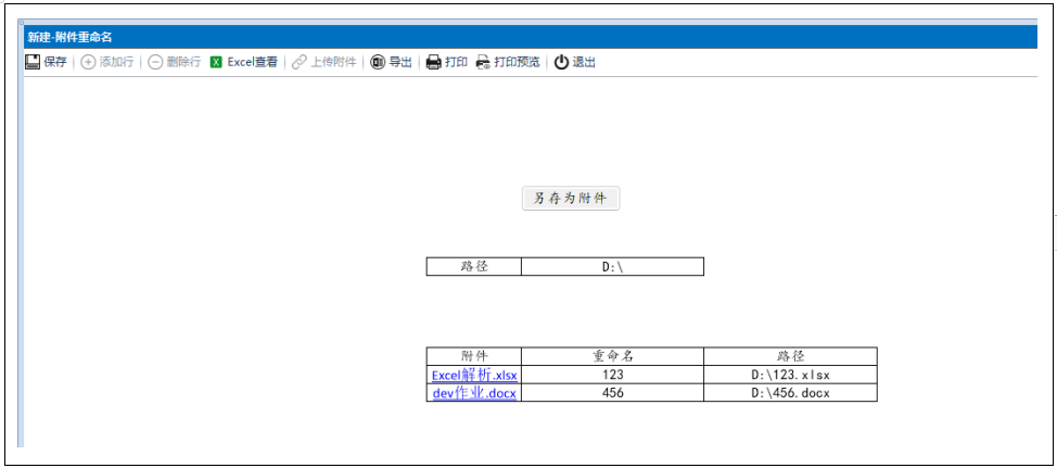 上一页 需求:将上传的附件重命名存入主表定义一个路径字段,不用每次填写路径明细表定义附件字段(上传附件),重命名字段(新的名字),路径字段(拼接出新的路径字段)明细中的路径为主表的路径,加上重命名字段,再加上附件的后缀名定义报表命令,使用按钮点击事件用于测试效果 下一页作者:严双圆 创建时间:2022-07-26 14:50最后编辑:test 更新时间:2025-10-14 15:38