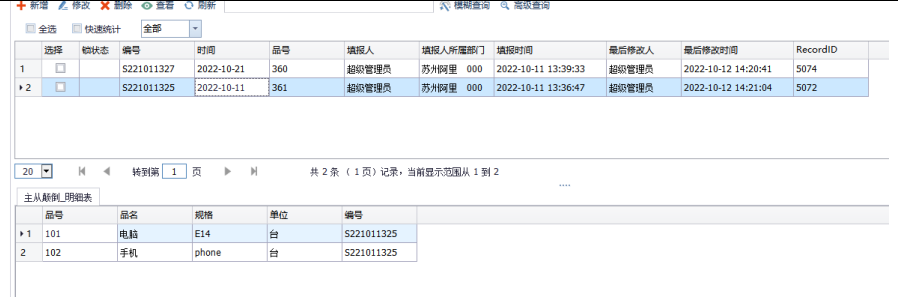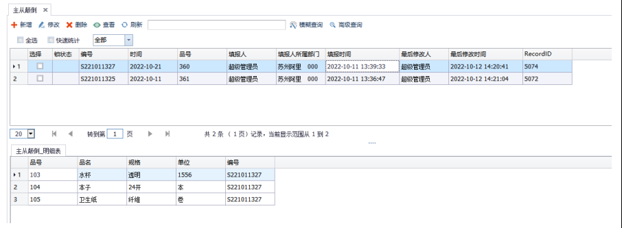 首先我们来看一下颠倒之前的数据(共2条主表数据,1个有3条明细,1个有2条明细)