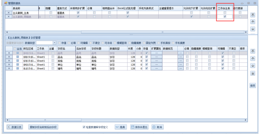 在【管理数据表】中勾选明细表为【工作台主表】