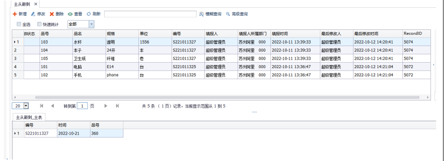 我们可以看到,工作台显示的是将明细表当成主表显示出来,共5条数据
