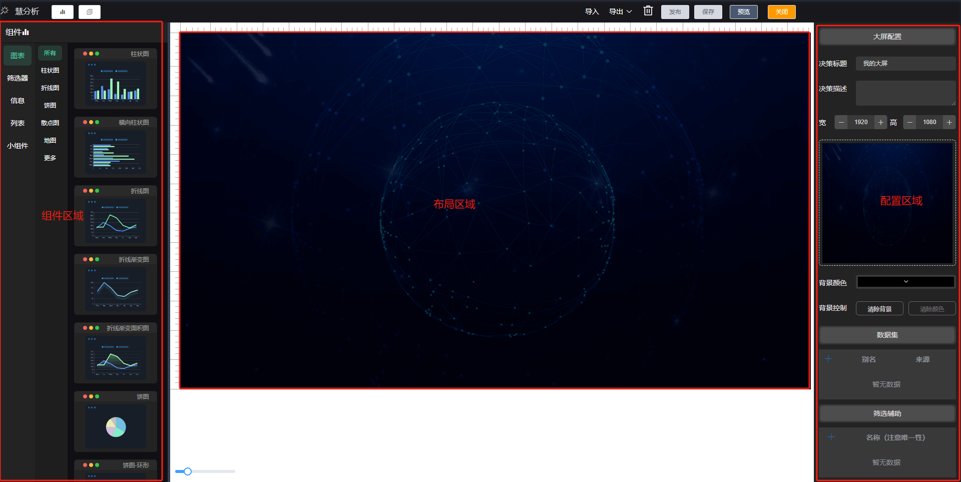 配置区域:配置整体大屏的数据集,各组件数据、字体、颜色等