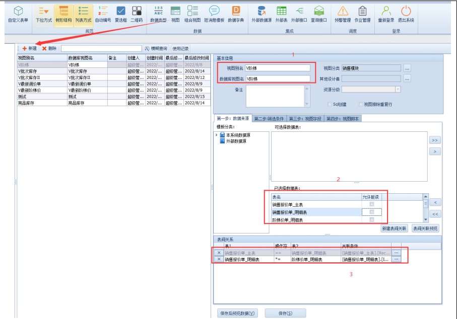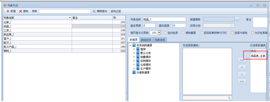 点击新建,弹出新建列表方式的框,填入列表名称(取个名字),数据源用于选定列表方式的来源,可以选择多表进行表间关联,筛选条件用于筛选需要的数据,可以不填,列表字段用于选择需要的字段