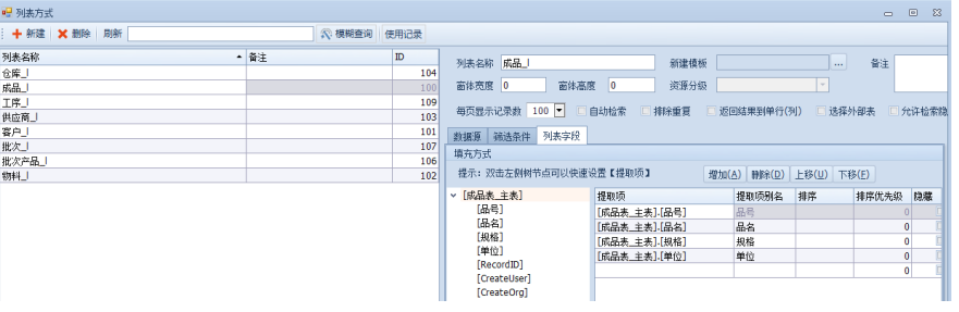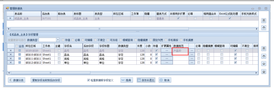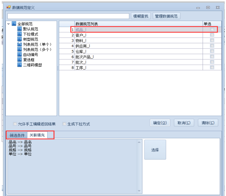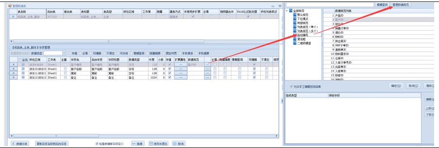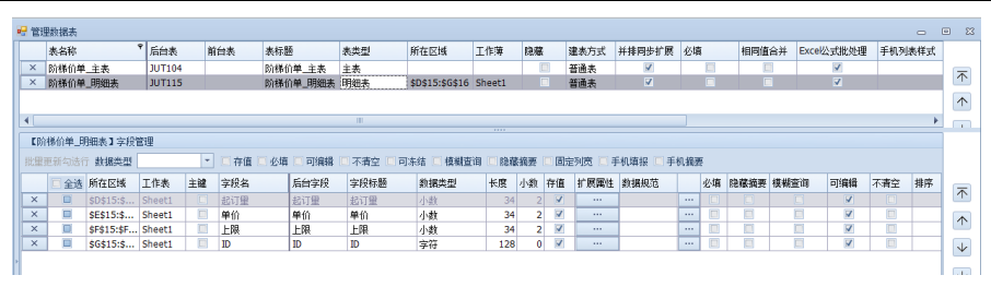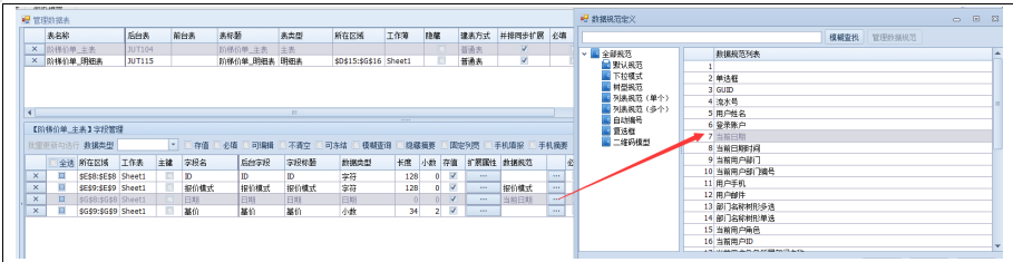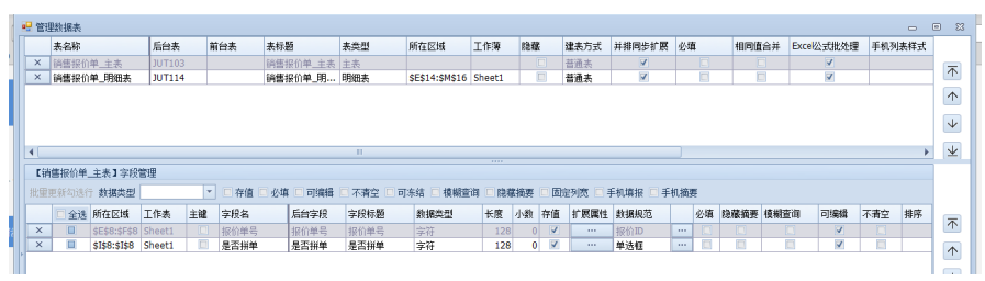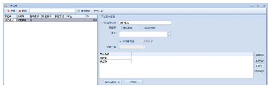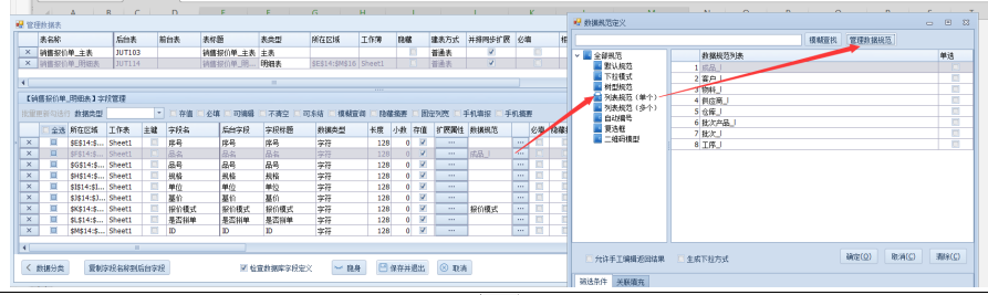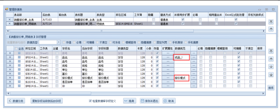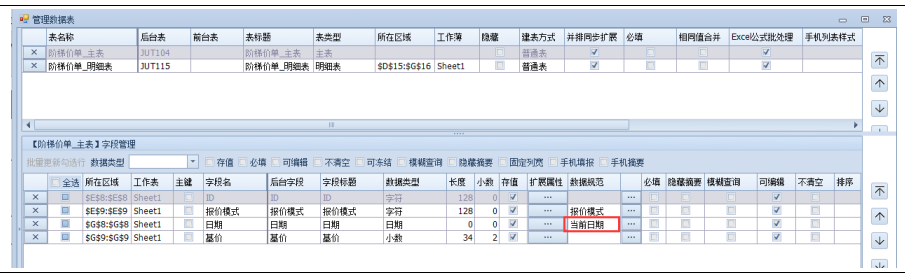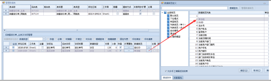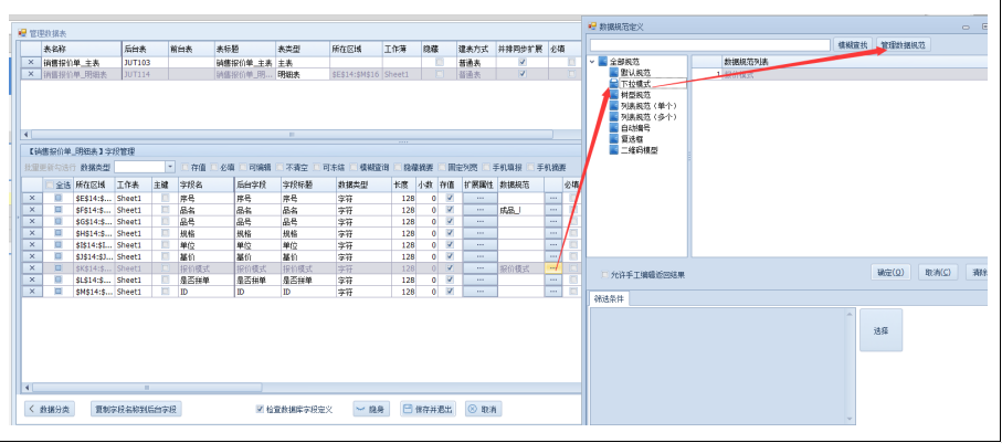 打开【管理数据表】,我们可以看到【品名】和【报价模式】字段绑定了数据规范,其中【品名】字段绑定的是列表数据规范,【报价模式】绑定的是一个下拉数据规范