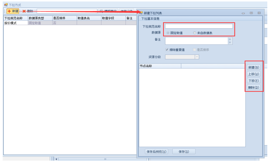 点击新建,同上数据规范的建立,给下拉取个名字,选择数据源,数据源有两种方式,一种是固定值(如性别),还有一种是来源于其他的表;下面可以新建节点,上下移动节点位置。