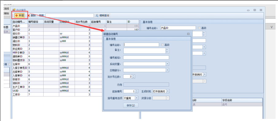 选择新建,弹出新建自动编号的框,填写编号名称(起个名字)、选择编号前缀、系统变量、日期部分,这些是可选项,也可以不选。指定流水号位数,起始编号为几,指定生成时机,点击保存。
