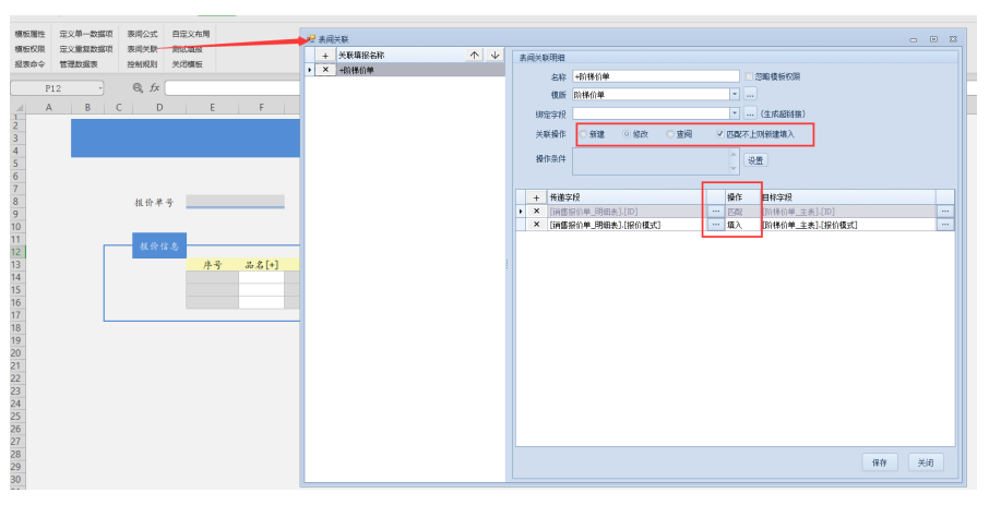 点击工具栏的【表间关联】,填写表间关联名称,选择关联的模板,【绑定字段】是生成超链接的形式,本次我们不需要;【关联操作】选择修改和匹配不上则新建填入,即如果已有该产品的阶梯价单,我们是修改操作,如果没有,则新建一张阶梯价单。用报价单中的ID去匹配阶梯价单中的ID。