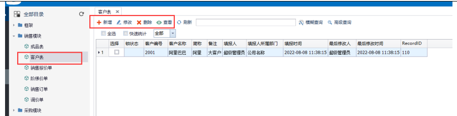 这样我们的客户表就建立好了,以后的定义字段和模板权限将不再进行详解。
