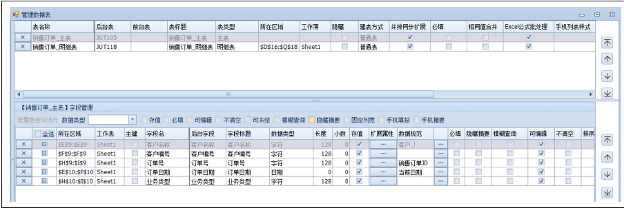点击【管理数据表】,查看主表,客户绑定客户列表,订单号为自动编号,日期选择当前日期