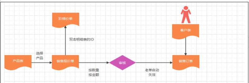 流程:现有一个产品表,然后再销售报价中选择产品对其进行报价,双击报价明细表中的ID号,跳转至阶梯价单,在阶梯价单中填写产品的阶梯价,报价模式有按金额和按数量两种,销售报价单经过审核后生效,并且老单自动失效,最后销售订单根据阶梯价获取单价信息。