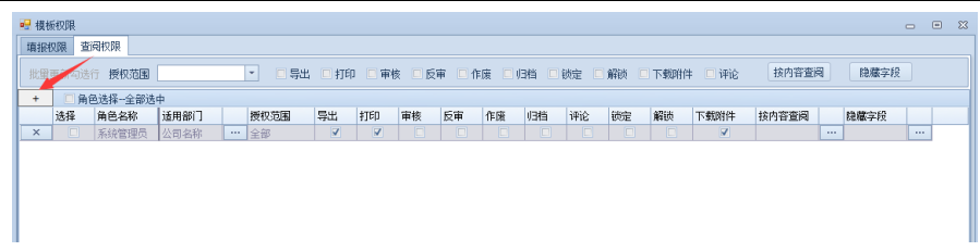 点击【查阅权限】,选定角色给查阅权限,包括查阅时候的导出、打印、审核、反审、作废、归档、评论、锁定等权限。