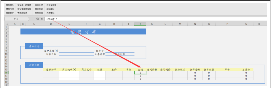 明细表中,选择商品,填写订单数量和金额,当有的字段是辅助字段或者数据下沉字段