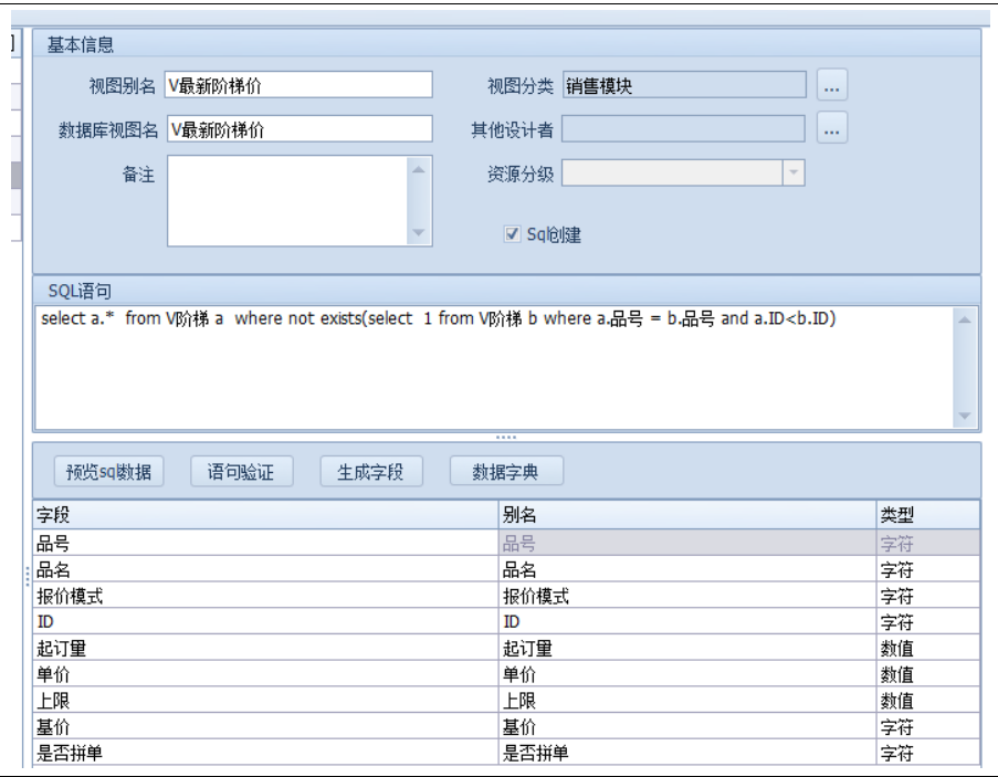 上面视图查找审核后销售报价单和阶梯价单的关联,要寻找最新的销售报价单,还需要建立一个视图。我们需要使用sql关键字 not exists ,查询上述视图中ID号最大的,因为越新的报价单,其ID号是越来越大的,所以从已经审核的报价单找出最大的ID,即最新的报价单。