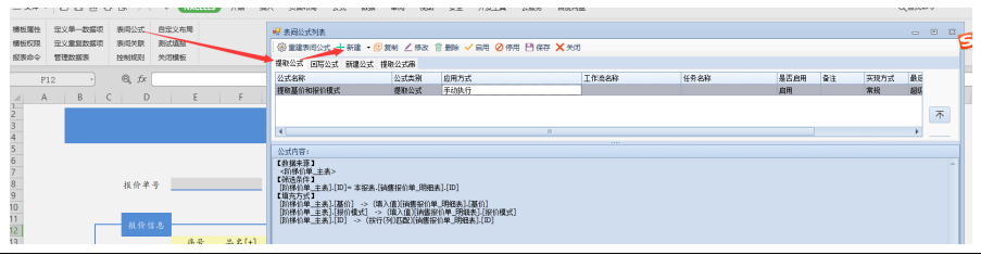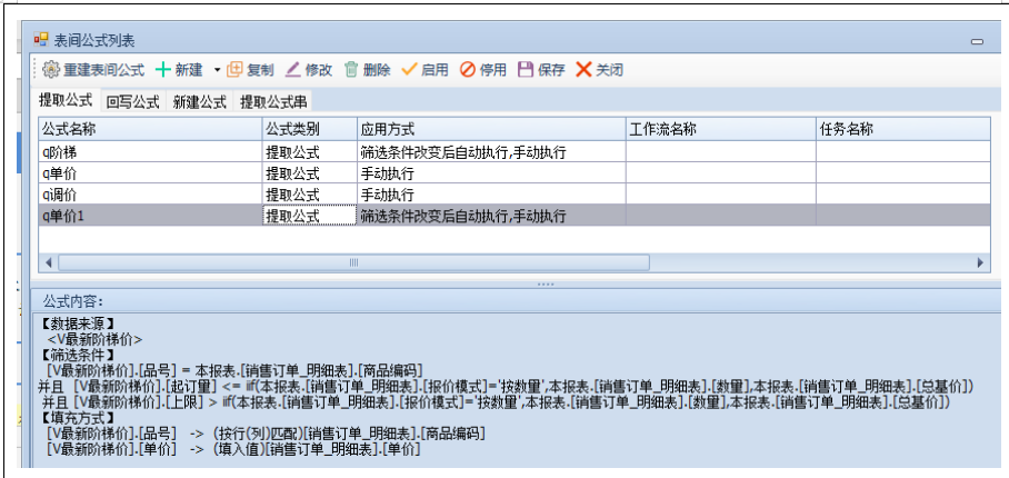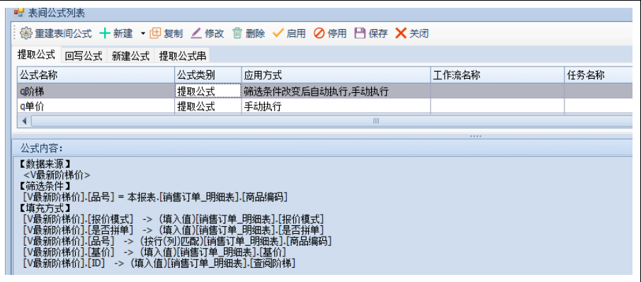 第二个提取公式,从最新阶梯价中提取单价信息,筛选条件中的意思是当报价模式是按数量的时候,起订量和上限与销售订单中的数量比较,否则是与总基价比较,将最新的单价通过商品编码按行列匹配到销售订单明细表中的单价字段。