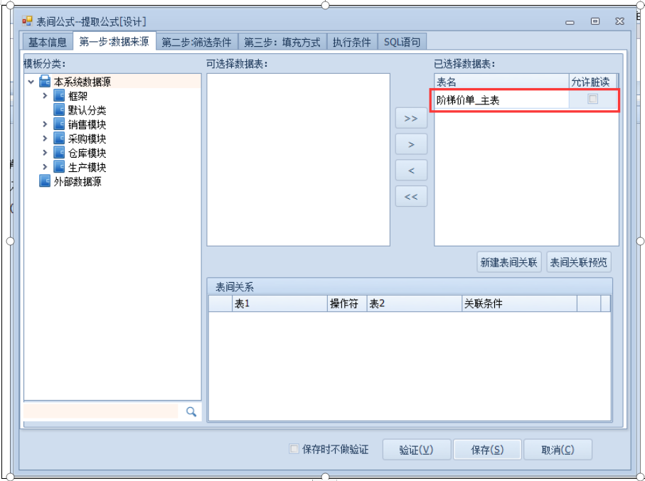 建立一个视图查询出已经审核的销售报价单,给视图一个名称,选择数据来源(销售报价单的主表和明细表,还有阶梯价的明细表),建立表间关系,销售报价单主表和明细表内连接,关联条件为([销售报价单主表].[RecordID] = [销售报价单明细表].[RecordID]),